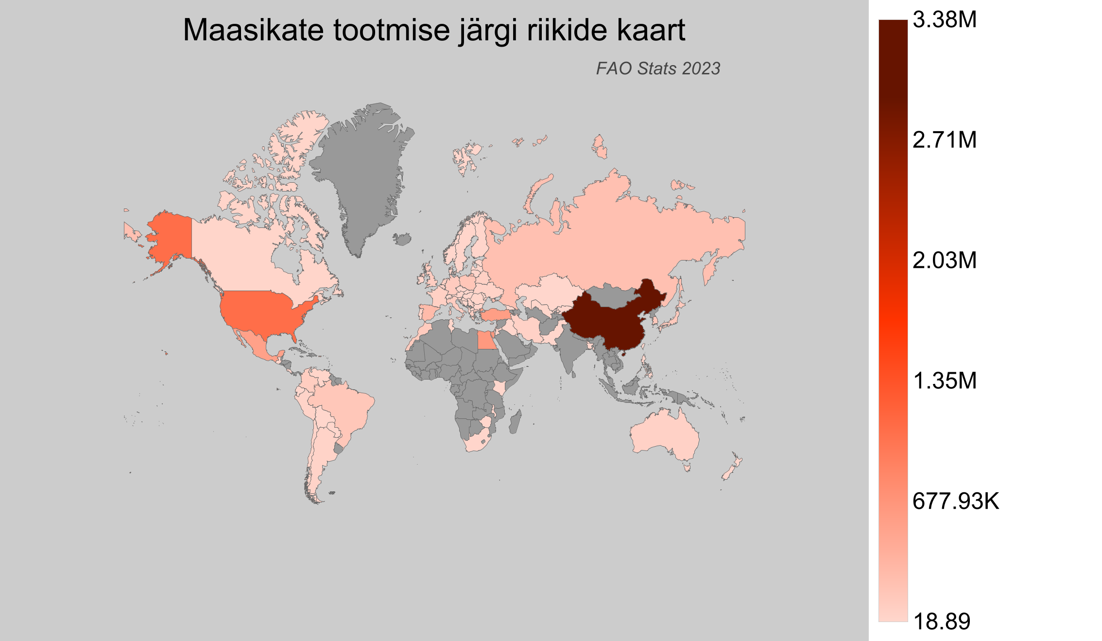 Maasikad on maitsev ja populaarne puuvili, millel on olulised turuväärtused ja tervisele kasulikud omadused. Need sobivad hästi mitmesugustes kliimatingimustes, kuid eelistavad parasvöötmelist kliimat. Mis muudab maasikad eriti atraktiivseks, on nende kohandumisvõime ja laialdane kasvatamine üle maailma. Antud andmed aastaks 2023 pärinevad toidu- ja põllumajandusorganisatsiooni (FAO) statistikabaasist, mis on värskeim andmestik saadaval aastaks 2025.
