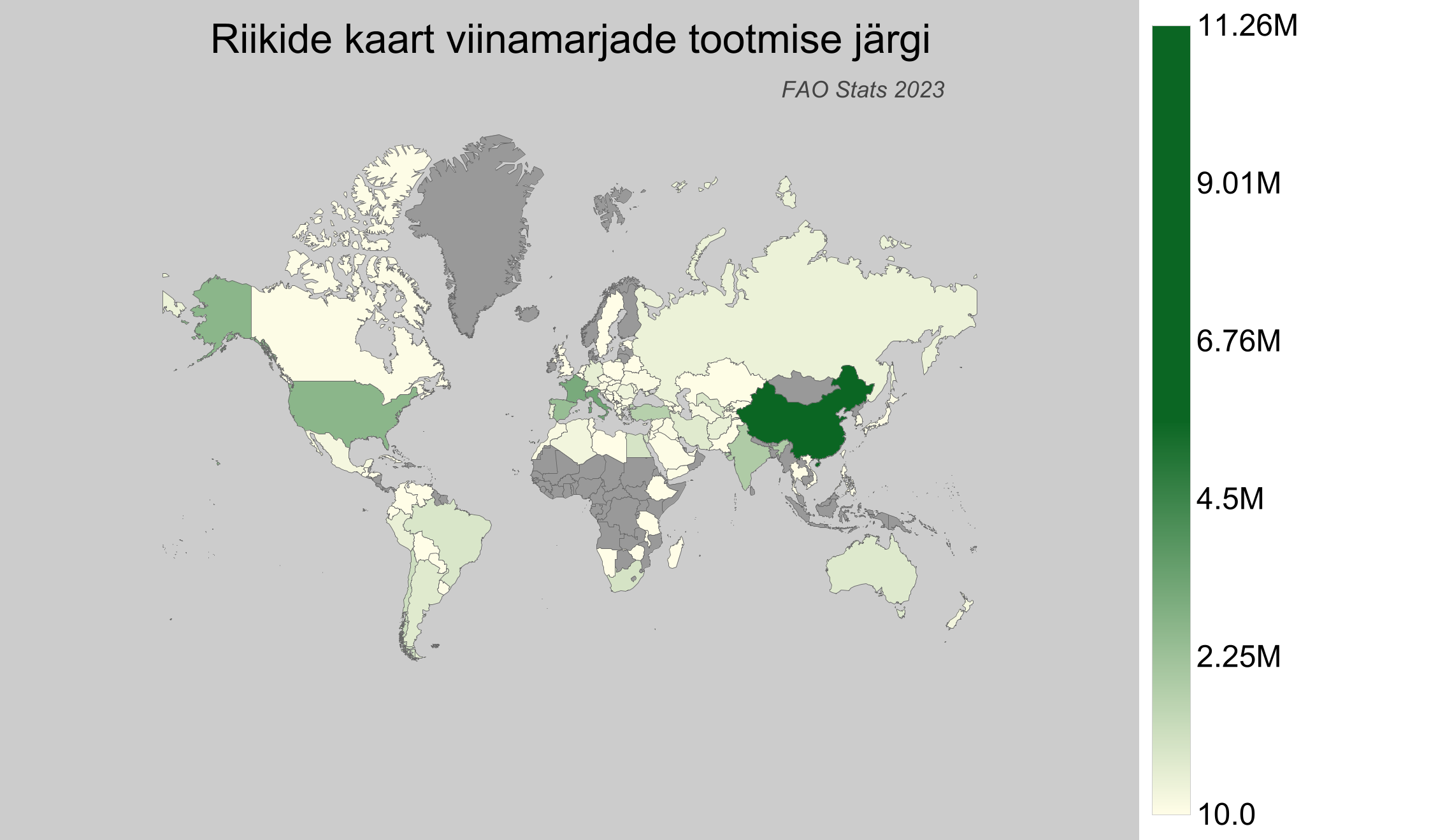 - aastal oli viinamarjade tootmine maailmas ligikaudu 72 miljonit tonni. Aastakümnetega on tootmise trend üldiselt tõusuteel, kui võrrelda 1961. aasta ligikaudu 43 miljoni tonniga. Viinamarjade globaalne tootmine on märkimisväärselt kasvanud ja 2023. aasta näitab jätkuvat tugevat toodangut.
